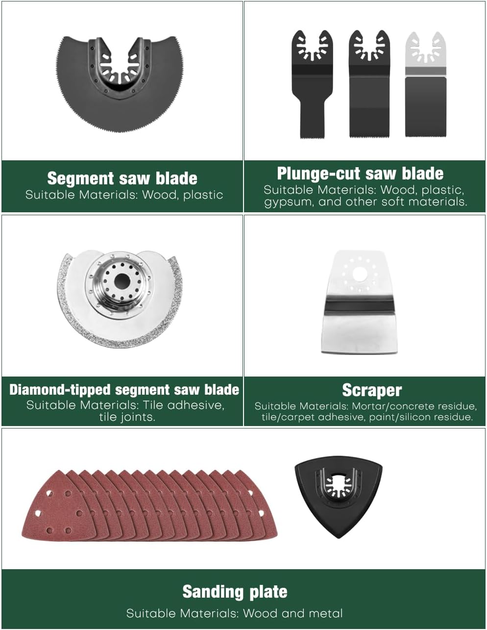 【𝐊𝐈𝐌𝐎 𝐌𝐮𝐥𝐭𝐢𝐭𝐨𝐨𝐥 𝐊𝐢𝐭 𝐃𝐨𝐞𝐬 𝐈𝐭 𝐀𝐥𝐥】Accessories: Plunge-cut saw blade*3, Segment saw blade*1, Diamond tipped segment saw blade*1, Scraper*1, Sanding plate*1, Sanding sheet*15 (per 5pcs in P60,P80&P120), Handle*1, Depth Guide*1, 20V Li-Ion Battery*1, Charger*1. KIMO cordless oscillating tool with battery allows you to perform various tasks such as cutting, sanding, scraping, grinding, and more. Go with those high performance blades, cut into wood, pipe, sheet rock like butter.