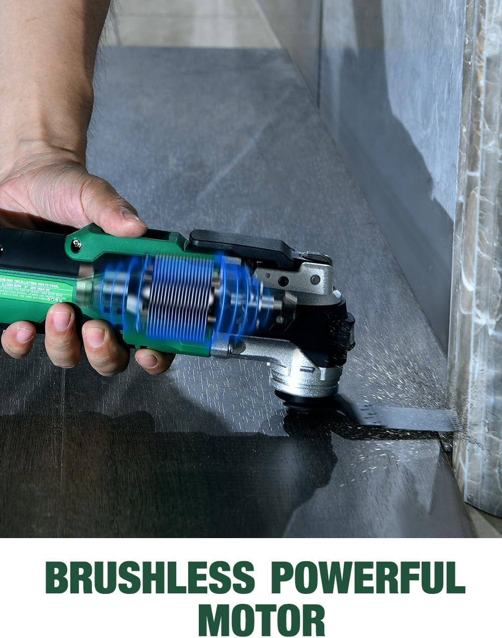 【𝐋𝐄𝐃 𝐋𝐢𝐠𝐡𝐭 & 𝐏𝐨𝐰𝐞𝐫 𝐂𝐮𝐞 𝐋𝐢𝐠𝐡𝐭】KIMO brushless & electric oscillating saw has “Two Lights”: LED light and power cue light. LED light help to highlight the cutting or sanding area, Besides, it provides an added safety feature by illuminating potential hazards or obstacles that may be present in the working area. Such as hidden nails or screws. This power cue light allows you to gauge the remaining battery life and plan your work accordingly, ensuring uninterrupted operation.